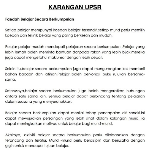 Contoh karangan upsr untuk subjek bahasa melayu bagi murid tahun 6 ada 2 kategori bagi karangan bahasa melayu ini iaitu karangan berformat dan juga karangan. Harini kami ingin kongsikan contoh dan latihan karangan bahasa melayu pula. Tingkatan 4 dan 5.